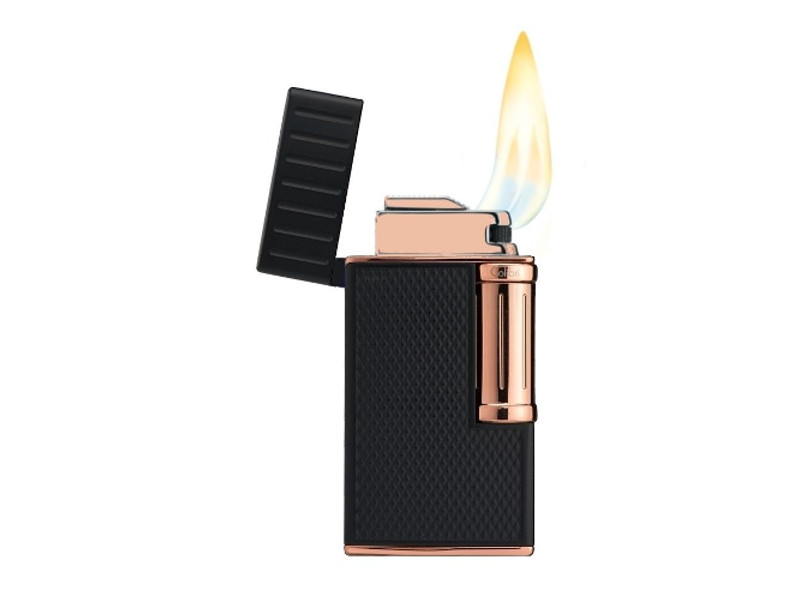 Colibri Julius márkájú tűzköves szivaröngyújtó fekete és vörösarany színben, oldalán rácsos mintával. A krómozott elemek fiatalos és vonzó stílust kölcsönöznek a Colibri Julius szivaröngyújtónak.