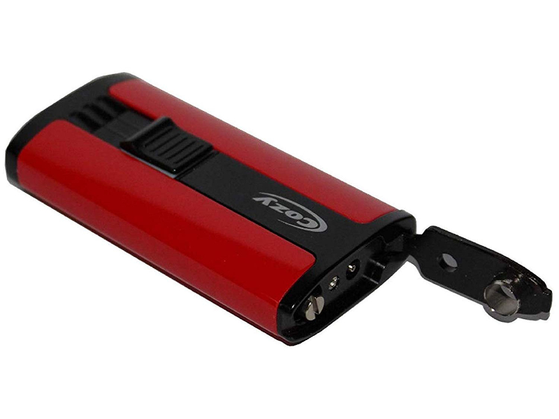 Dupla szúrólánggal égő Cozy szivaröngyújtó fekete/piros színben, aljába beépített 9mm-es szivarfúróval. Utántölthető, állítható lángmérettel.