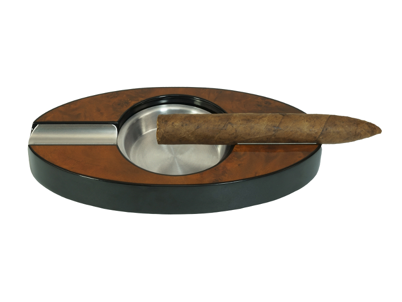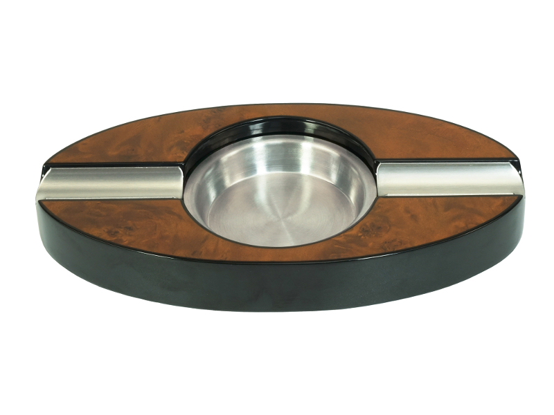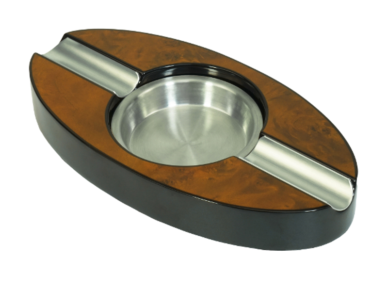 Lakkozott, barna színű, ovális szivar hamutartó két szál szivar részére, fém betéttel.