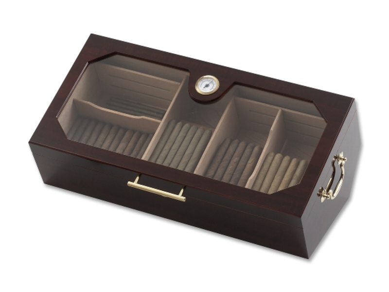 Nagyméretű, cédrusfa gasztro humidor, üveg tetővel. 5-7 fakkra osztható szivar tároló doboz, 2 db nagyméretű akrylpolimer kristályos párásítóval és külső hygrométerrel. A tető kulccsal lezárható. Az elején és mindkét oldalán ezüst színű fogantyúval.