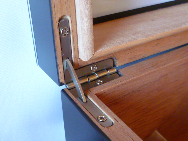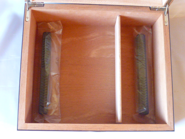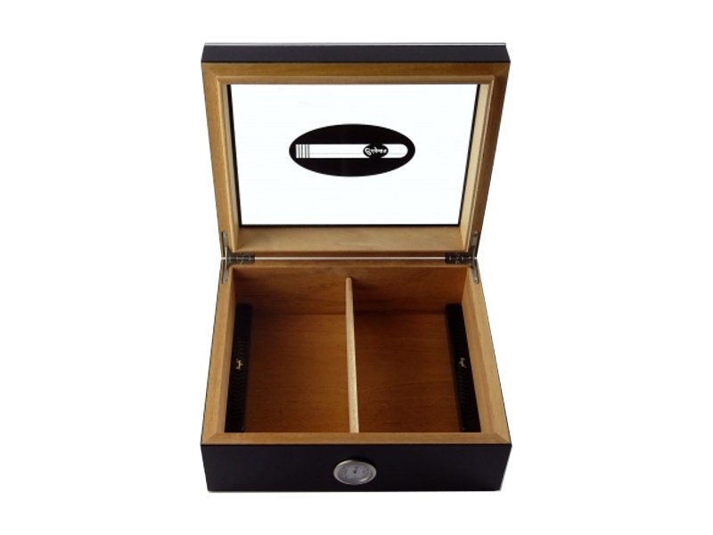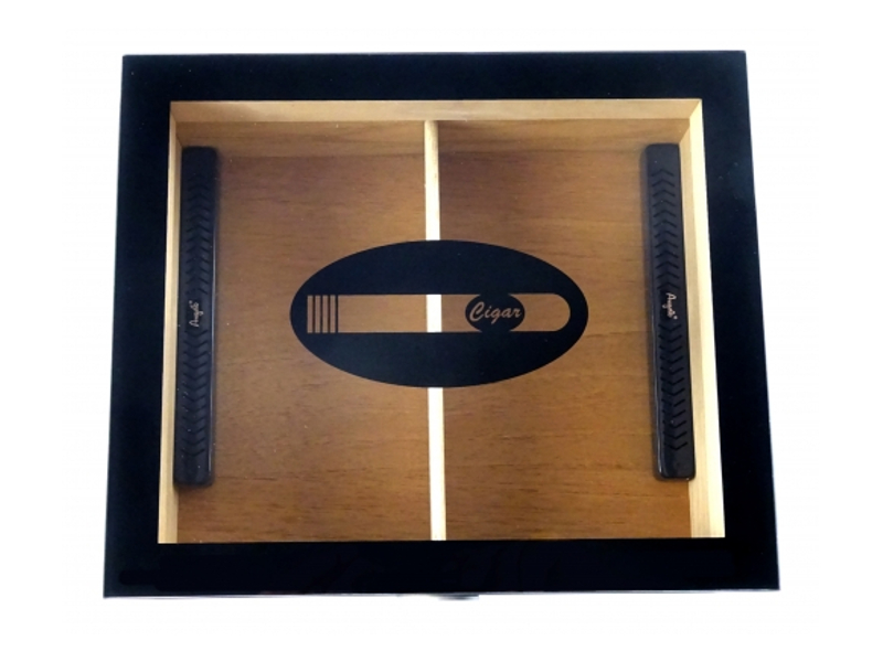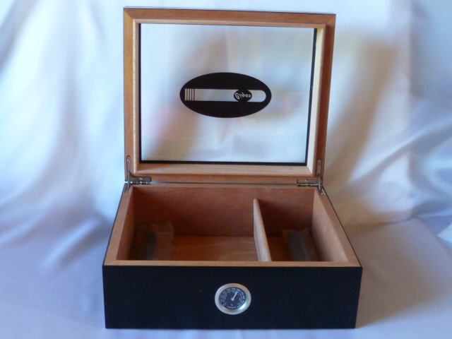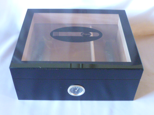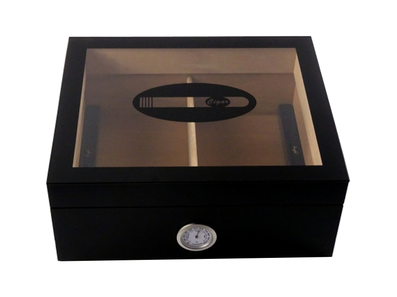 Olyan szivar tartó doboz, amely kb. 50 szivar tárolására alkalmas. Cédrusfa, fekete színű szivartartó humidor, párásítóval és külső hygrometerrel. Üveg tetővel, a tetején szivar dekorációval.