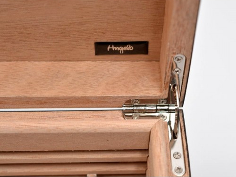 Exkluzív barna színű, csíkos luxus szivar tartó doboz kb. 50 szivar tárolására alkalmas (a szivargyűrű mérettől függően). Angelo szivar tartó humidor, rácsos spanyol cédrusfa belsővel és elválasztó léccel. Külső digitális hygrométerrel és süllyesztett zsanérokkal.