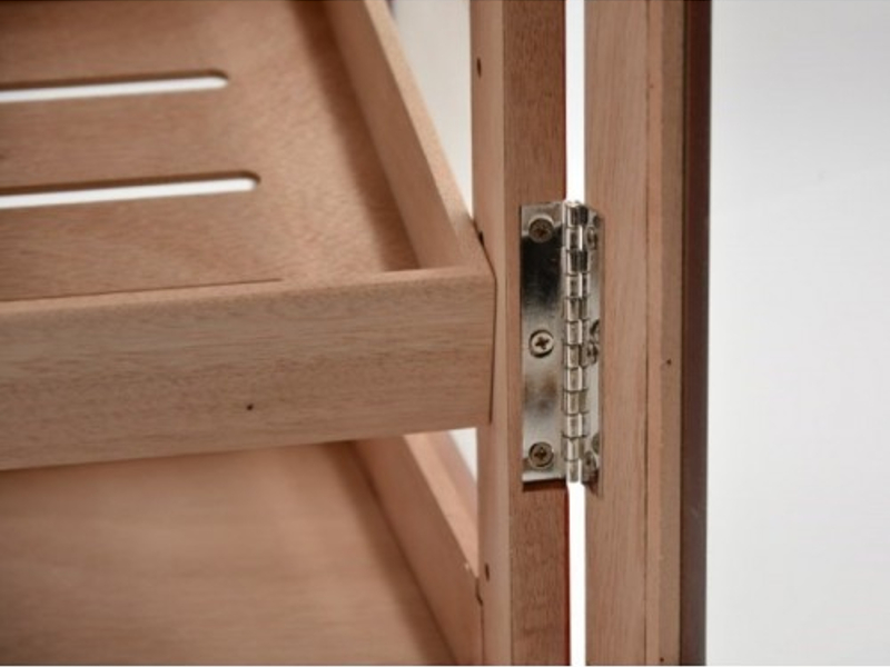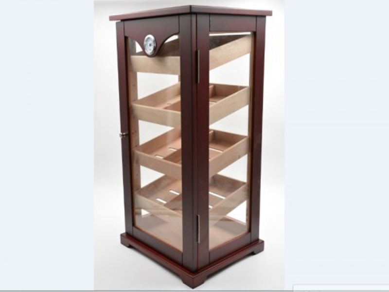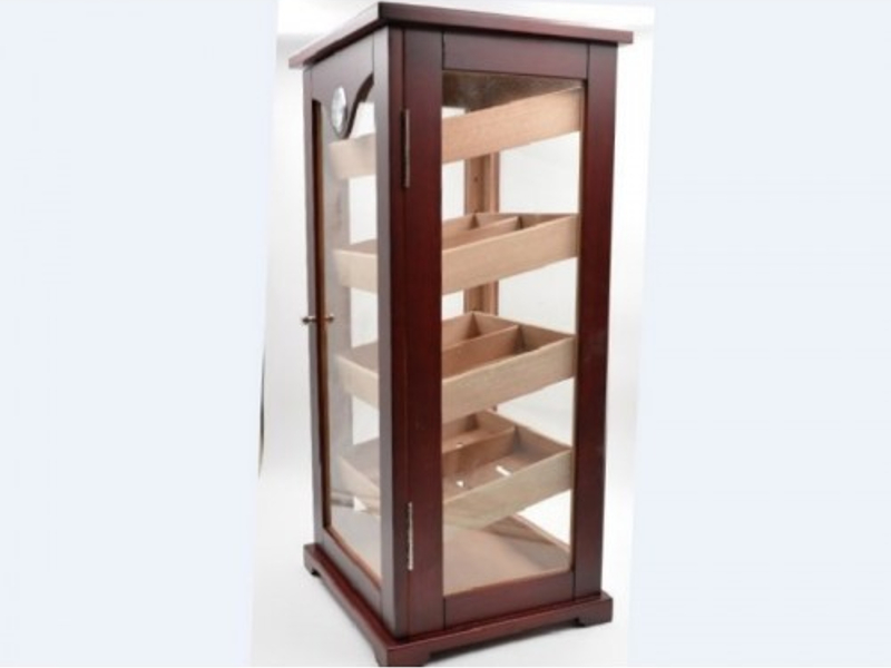 Nagy méretű szivar tartó szekrény, kb. 150 szál szivar tárolására. A humidor szekrény mind a négy fala üveges, belseje cédrusfa, valamint 4 db cédrusfából készült döntött fiókkal. A fiókok magassága állítható, így akár szivardobozokat is tudunk benne tárolni. A fiókok tartalmaznak választó lécet és úgy vannak kialakítva, hogy a levegő tudjon benne cirkulálni. Így biztosítják a szivaroknak a megfelelő klímát, ami az szivarok éréséhez szükséges. A szekrény ajtajába van beépítve egy fehér számlapos higrométer. A szivar szekrény tetejében pedig az Akrylpolimer kristályt tartalmazó párásítót tudjuk elhelyezni tépőzárak segítségével, amennyiben ezt szeretnénk. Az ajtókeret belülről, körben légzáró betéttel ellátott, ami azt a célt szolgálja, hogy a szivar tároló szekrény ne karcolódjon. Az ajtó mágneszáras és kulccsal zárható.