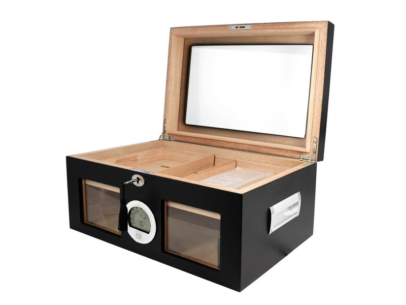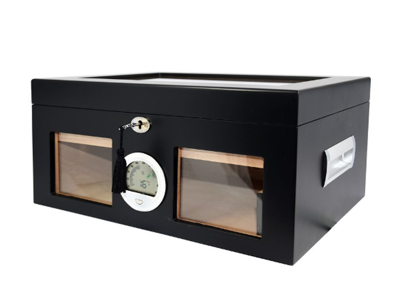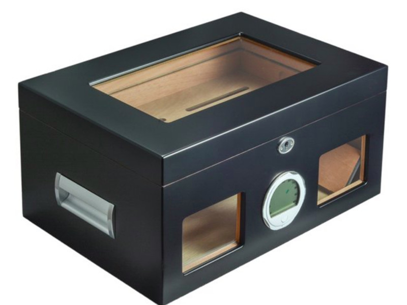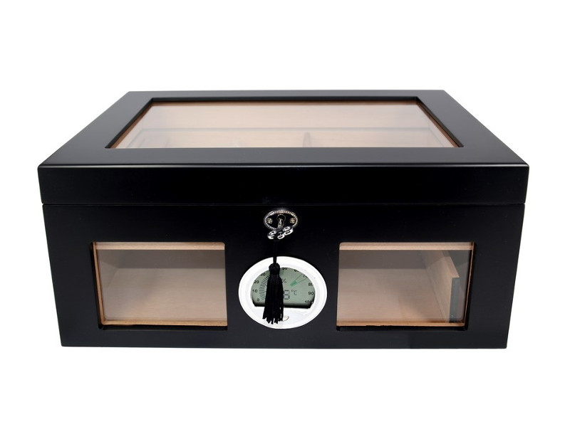 Gasztrohumidor 100 szál szivar részére, üveges spanyol cédrusfa szivar doboz, párásító, digitális hygrométer - fekete, Achenty!