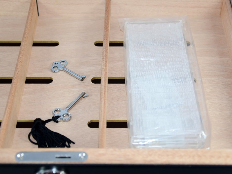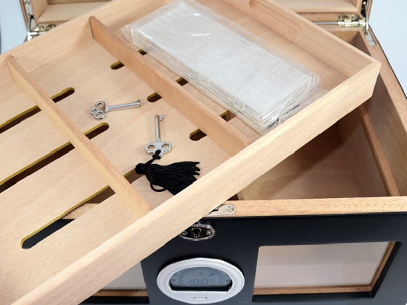Fekete színű, üveg tetős spanyol cédrusfa szivar tartó doboz, kb. 100 szál szivar tárolására alkalmas. Két szintes szivar tartó humidor üveg betéttel az elején, 3 db spanyol cédrusfa elválasztó léccel. A teteje kulccsal zárható, az oldalán ezüst színű fogantyúval.