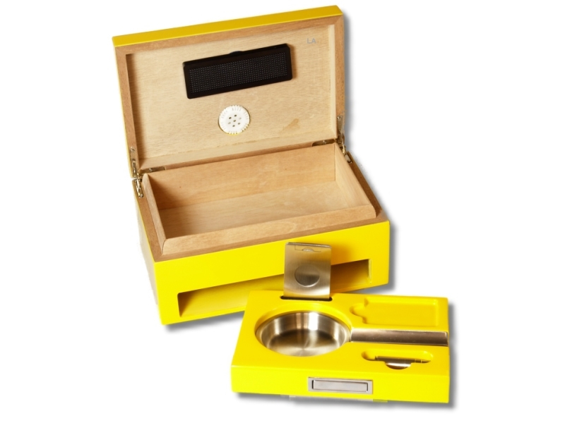 Kis méretű szivar tartó doboz, amelyben kb. 5-10 szivart tárolhatunk. Sárga színű humidor, cédrusfa belsővel.