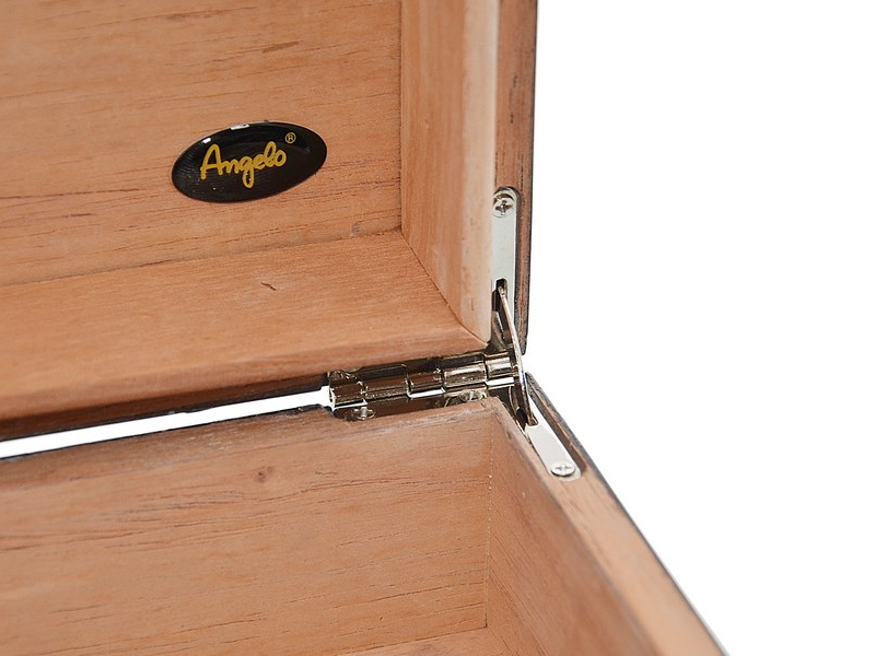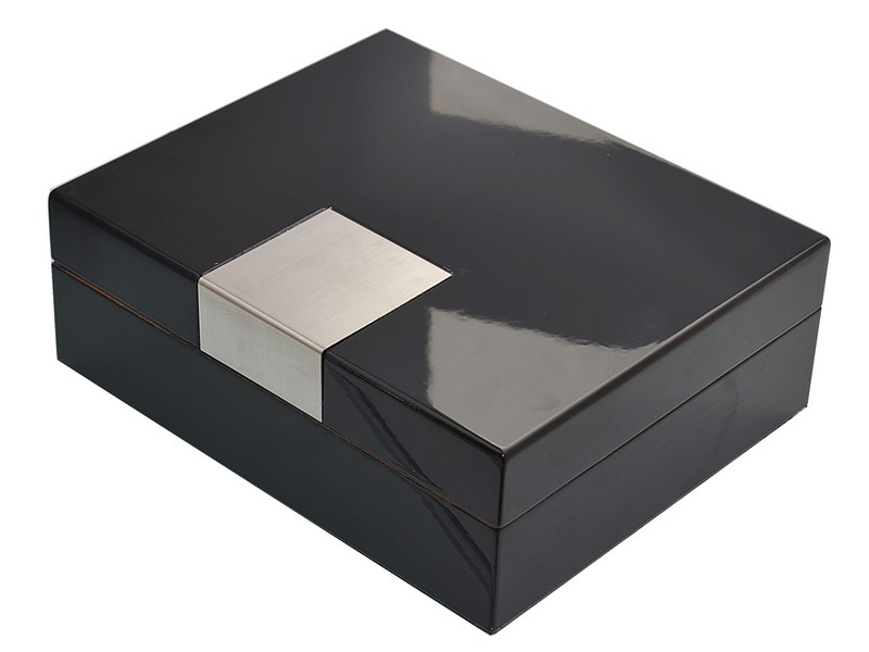 Fényes lakkfekete színű, elegáns szivar tároló humidor dekoratív fém betéttel a fedélen, amely kb. 10-15 szál szivar tárolására alkalmas, spanyol cédrusfa belsővel. Süllyesztett, stabil, krómozott négyszögletes zsanérokkal.