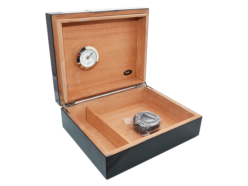 Humidor 15 szál szivar részére, lakkfekete cédrusfa szivar tároló doboz, párásítóval, hygrométerrel