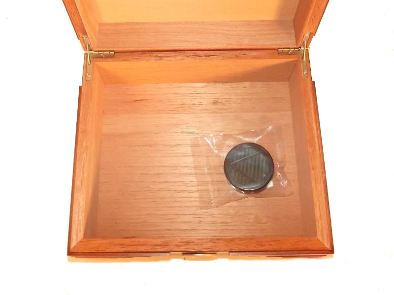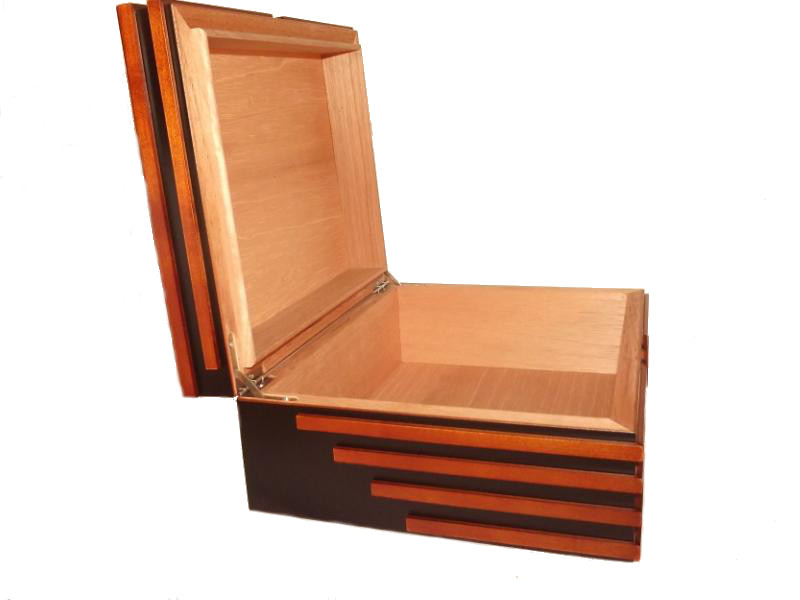 40 szivar tárolására alkalmas cédrusfa szivartartó doboz. Fekete és barna színű szivar tároló humidor, párásítóval és külső hygrométerrel. Különleges formatervezés.
