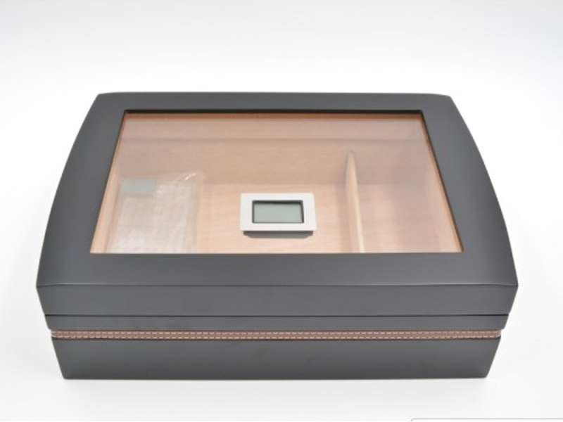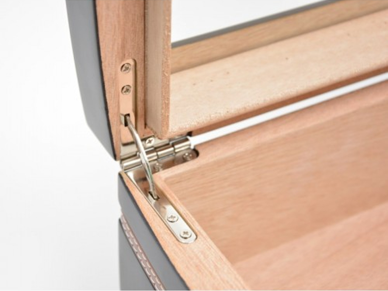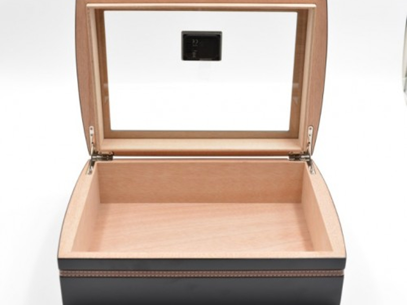Fekete színű, masszív cédrus szivar tartó doboz bőr borítással, amely kb. 40 szál szivar tárolására alkalmas. Az üvegtetőbe van beépítve a digitális hygrométer és a hőmérő. A hőmérséklet állítható Fahrenheit illetve Celsius (ºF vagy ºC) . Az oldalán körbe egy elegáns, varrott barna vékony bőrcsík díszíti, fehér varrással. A humidor alja fekete filccel van bevonva, hogy megóvja a bútorokat a karcolódástól. A humidor tartalmaz egy akrylpolimer kristály párásítót és egy választó lécet is. Süllyesztett króm színű zsanérokkal.