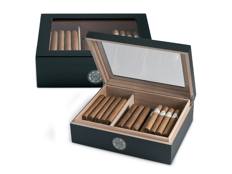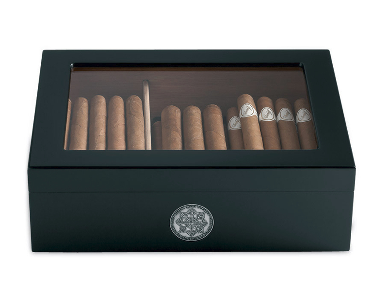 Medici Humidor 40 szál szivar tárolására alkalmas, cédrusfa belsővel, üvegtetővel, fekete színben. Szivacsos párásítóval.