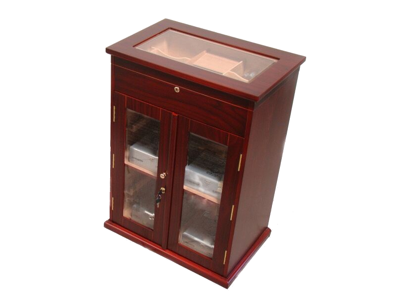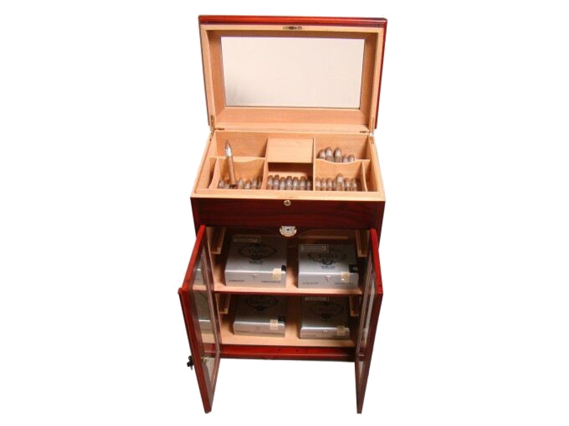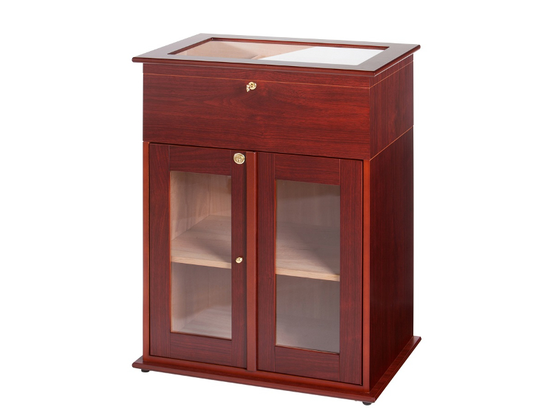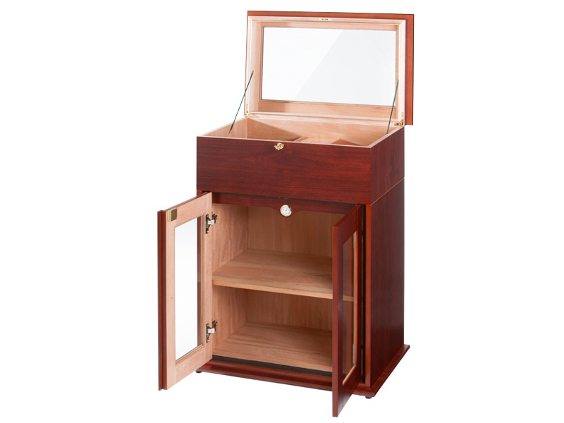 Nagy méretű, mahagóni színű szivar tartó szekrény, kb. 250-400 szál szivar tárolására alkalmas. A humidor szekrény elején mindkét ajtó kristályüvegből, kulccsal zárható. Belsejében a polc cédrusfából, itt elhelyezhető több doboznyi szivar is.