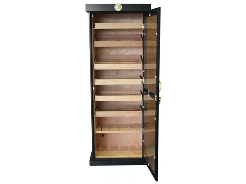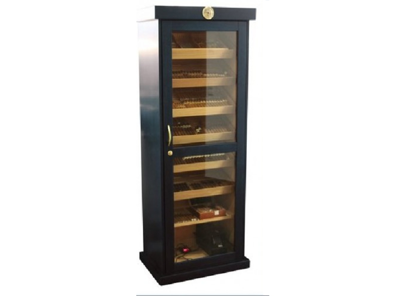 Óriás méretű, fekete színű humidor szekrény, amely kb. 600-800 szál tárolására alkalmas. A szivar tartó szekrény cédrusfa belsővel, üveg ajtóval, 7 db cédrusfából készült állítható, döntött fiókkal rendelkezik. A szekrény ajtókerete körben légzáró betéttel ellátott, mágneszáras, illetve az ajtó kulccsal is bezárható.