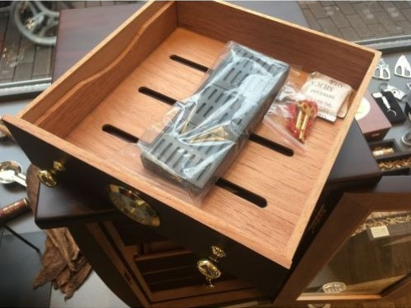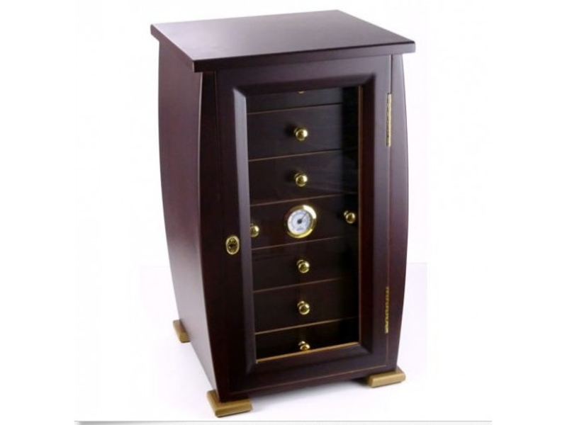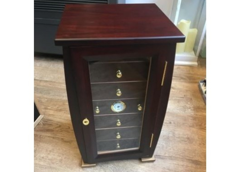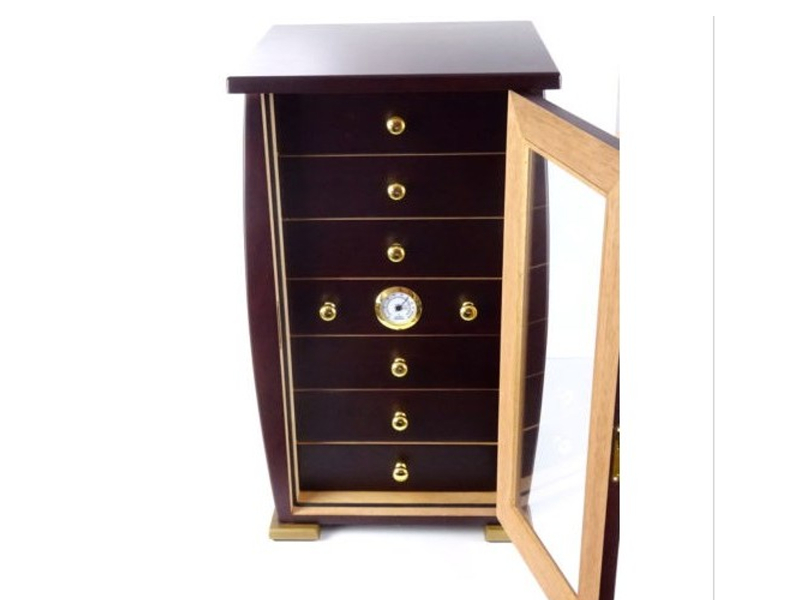 Sötétbarna, kézi munkával készített klasszikus cédrusfa szivar tároló humidor szekrény. Spanyol cédrus béléssel készített szivar tartó szekrény, amely kb. 80-100 szál szivar tárolására alkalmas. Üveg ajtóval, 7 fiók arany színű gombokkal és zsanérokkal, a középső fiókba illesztett hygrométerrel. Akrylpolimer párásítóval küldjük. Az ajtó kulccsal zárható. Pótkulccsal.
