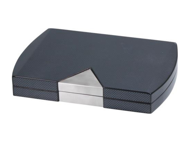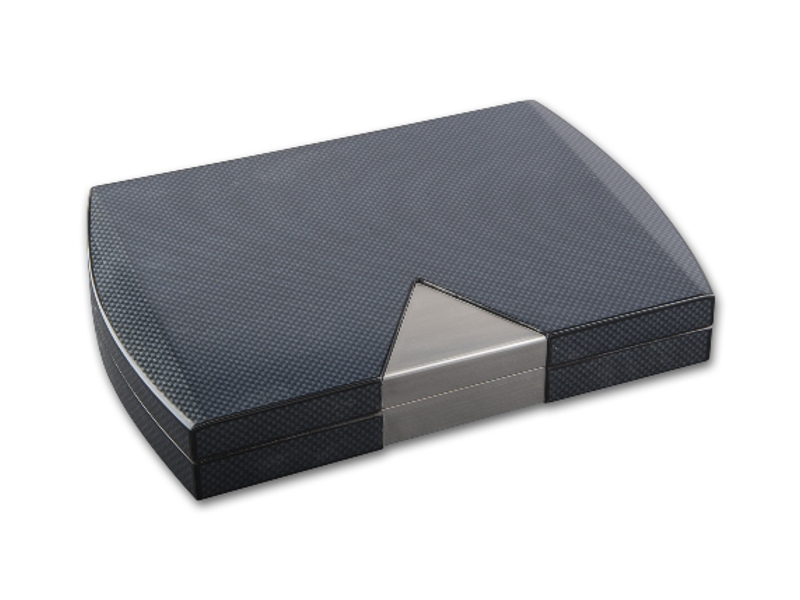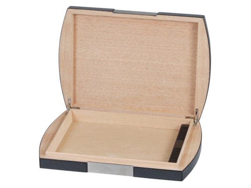 Fekete színű, carbon bevonatú szivar tartó doboz, amely kb. 10-15 szivar tárolására alkalmas, cédrusfa belsővel, fém betéttel díszítve.
