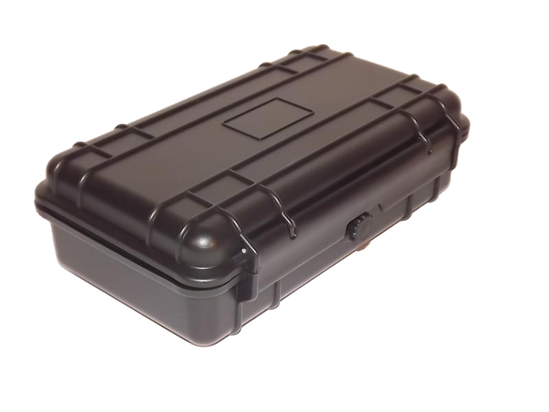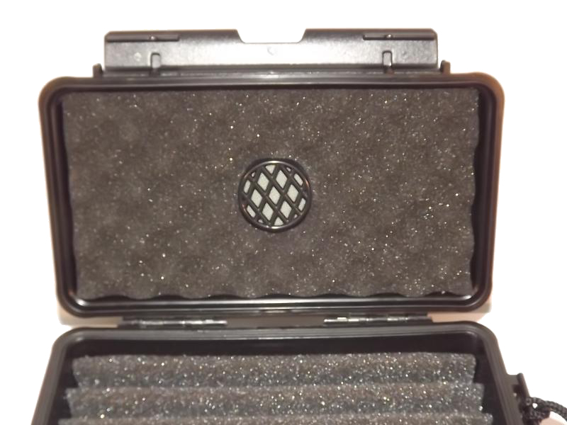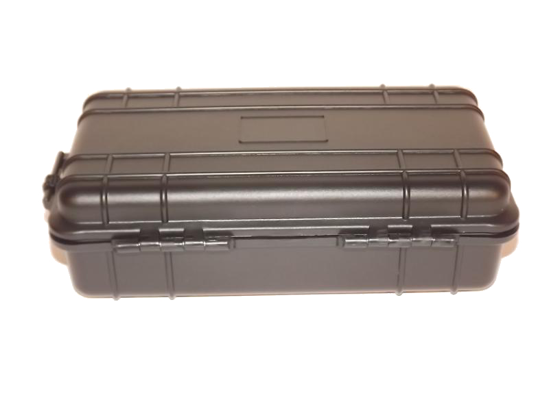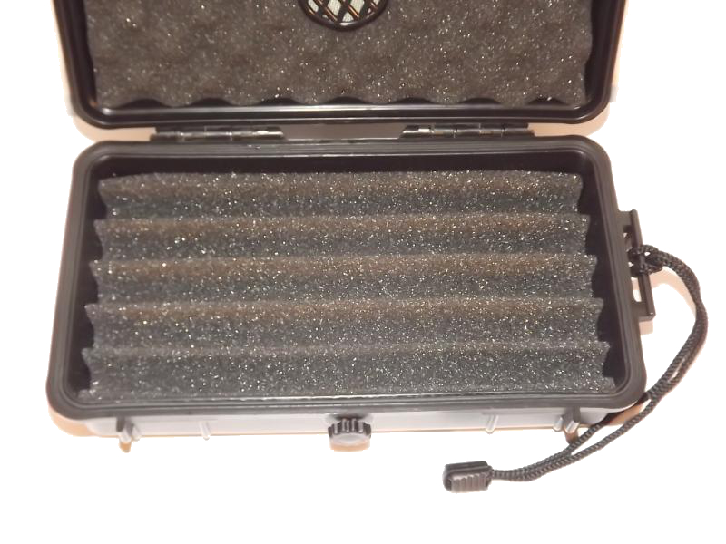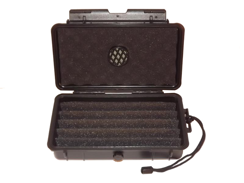 Fekete műanyag szivar tartó doboz, amely 5 szál szivar tárolására alkalmas, szivacsos béléssel. Szivacsos párásítóval.