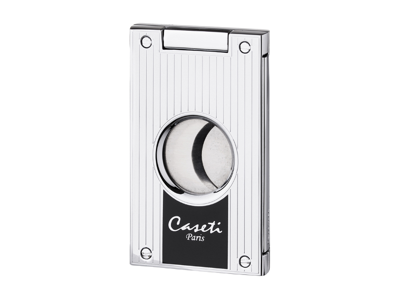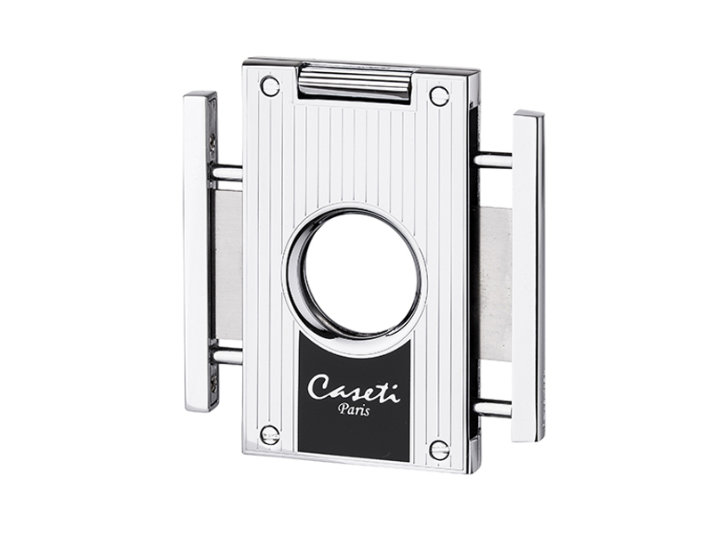 Rozsdamentes acélból készült, ezüst színű, dupla pengéjű, magasfényű krómozott Caseti szivarvágó, fekete színű mintával. A rozsdamentes acél dupla pengés szivatrvágó tökéletesen illeszkedik a kézbe, a rugós mechanika és biztonsági nyitógomb segítségével működtethető, így garantált a tökéletes, precíz vágás. A szivarvágót Caseti logó díszíti. A design a francia tervezők keze munkáját tükrözi. Bársony bélésű díszdobozban küldjük.
