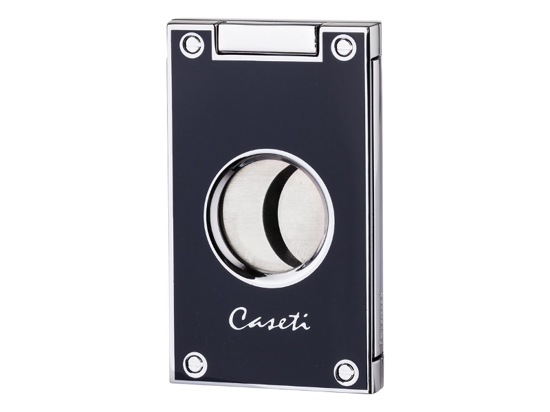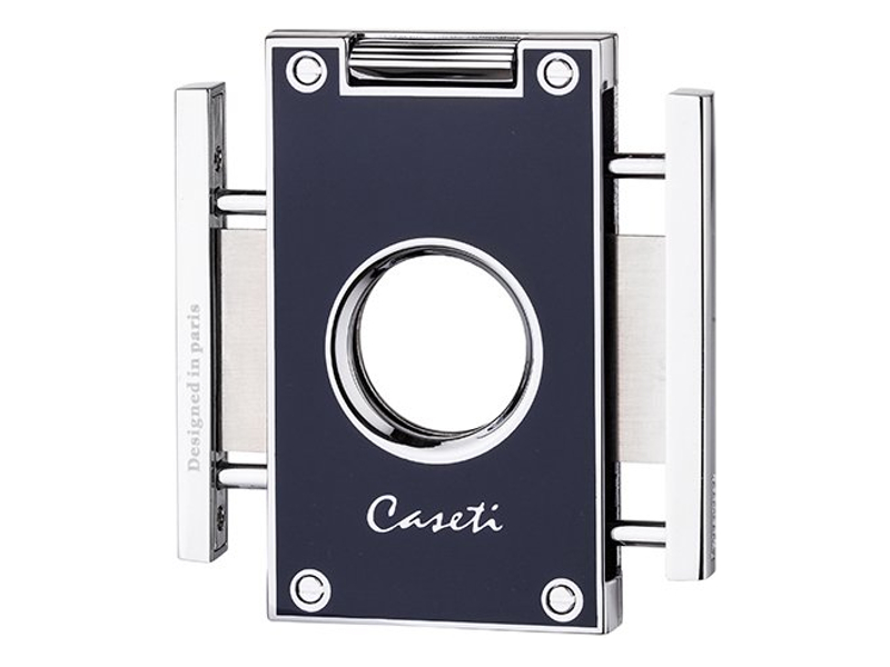 Elegáns sötétkék színű, két élű rozsdamentes acélból készült Caseti szivarvágó. A két rozsdamentes acélból készült penge egy gombnyomással nyílik.