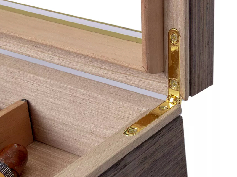 Világosbarna színű, diófa-dekor spanyol cédrusfa, aranyszegélyes üvegtetővel, amely kb. 30-40 szivar tárolására alkalmas. Az elegáns szivar tároló humidor a mintás üvegtetőbe épített külső, arany színű higrométerrel, párásítóval és süllyesztett arany színű zsanérokkal van ellátva.