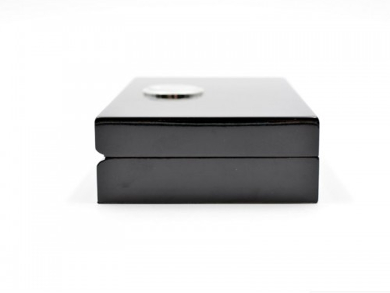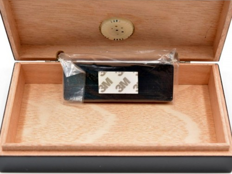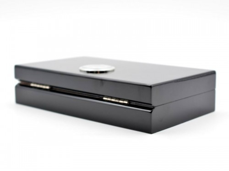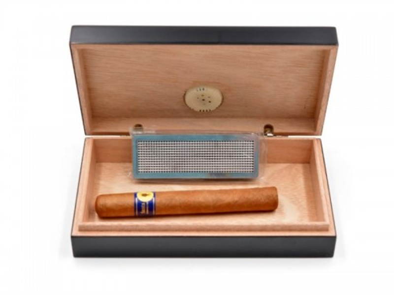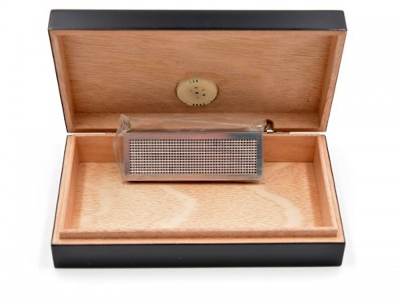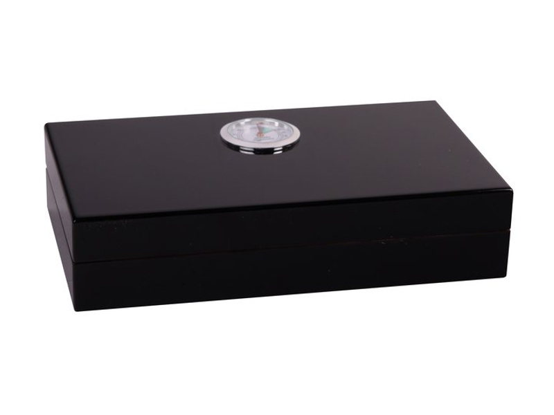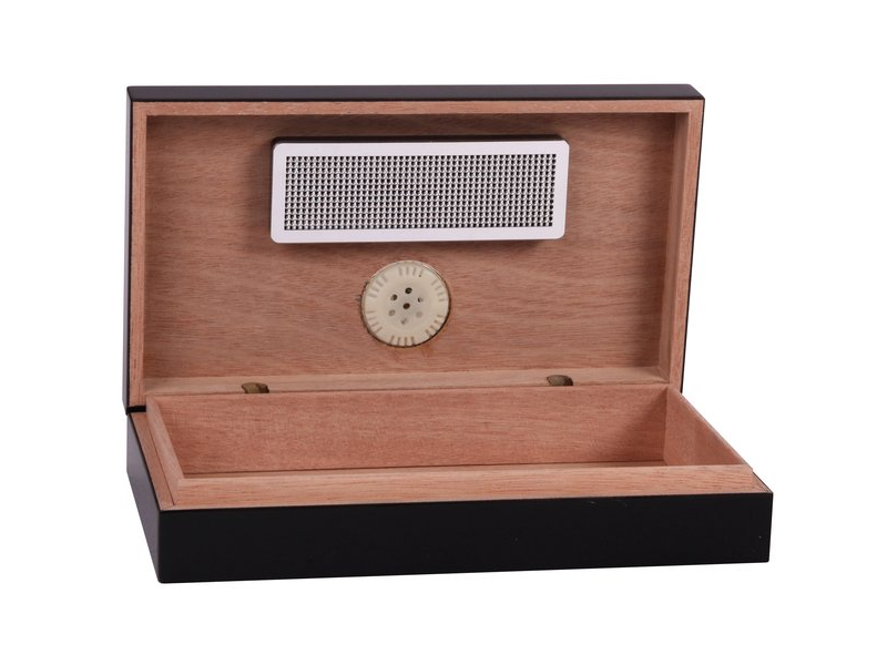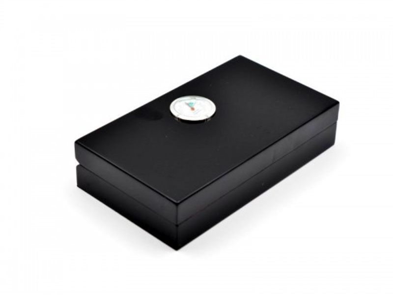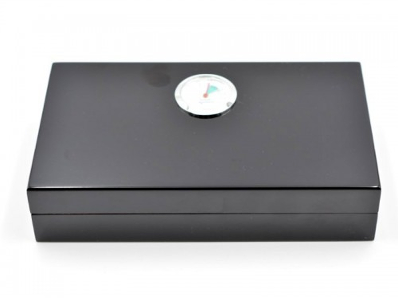 Szivar tartó doboz, ami kb. 5 szivar tárolására alkalmas, cédrusfa belsővel, fekete színben. Ezüst színű szivacsos párásítóval, amit öntapadós matrica segítségével tudunk rögzíteni és külső fehér hátlapos hygrométerrel.